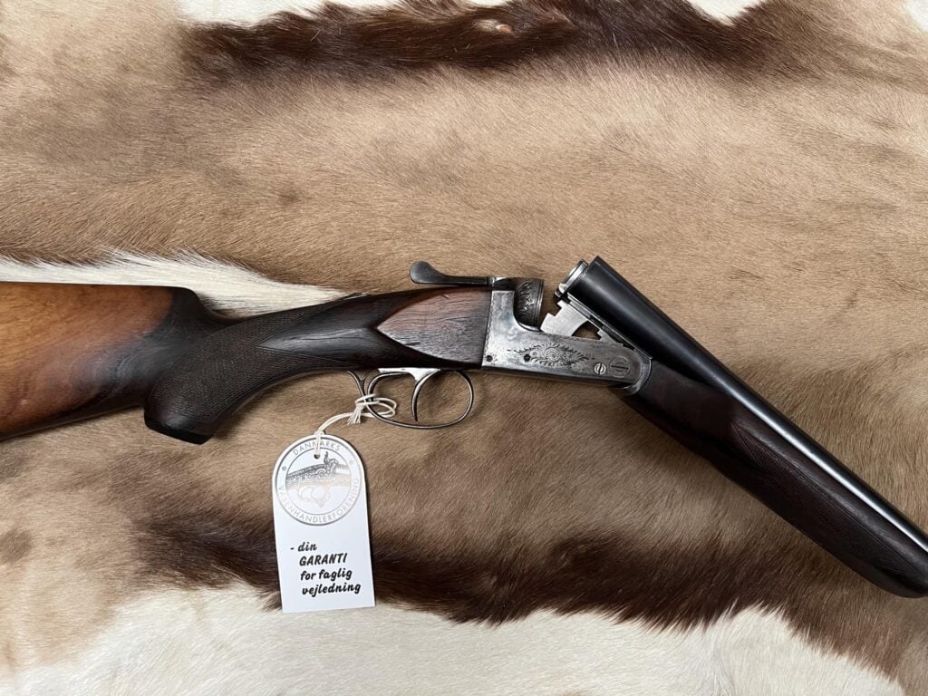 AYA Kal. 12/70 med bredt foreskæfte, ejektor og automatisk sikring.