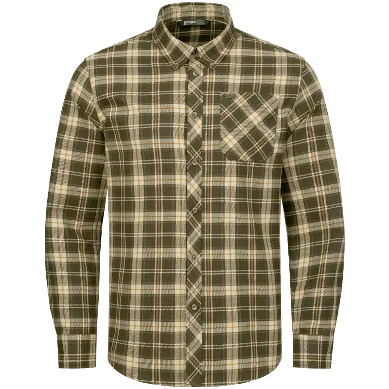 Langærmet button down flannelskjorte lavet af bomuld/polyestergarnblanding. Udvendig ferskenfarvet for blødere berøring, 1 toplomme, knap ned krave og Blaser-kantede brandingdetaljer på lommen og nederste stolpe foran.