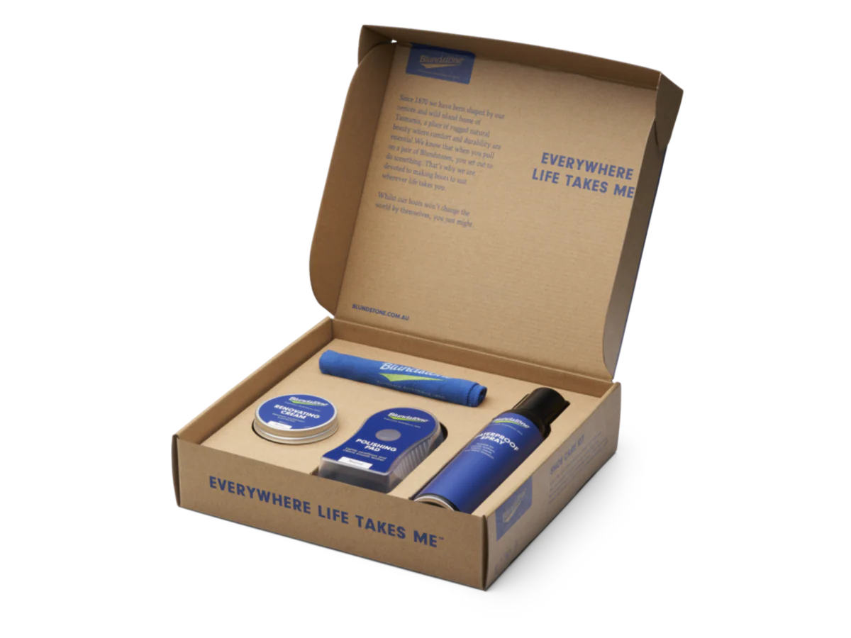 Blundstone Shoe Care Kit indeholder en vandafvisende spray, poleringspude, renovationscreme og poleringsklud.