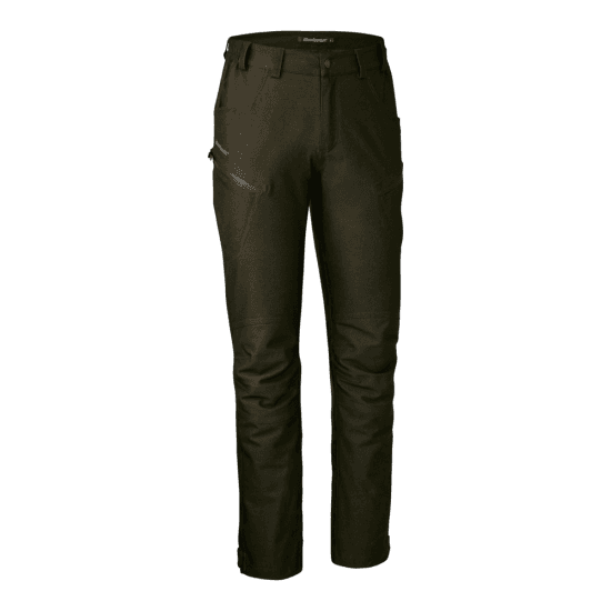 Deerhunter Chasse bukserne har formsyede knæ og en elastisk linning, der giver en behagelig pasform og øget bevægelsesfrihed. To forlommer og to lårlommer med lynlåslukning og en skjult knivlomme giver masser af opbevaringsmuligheder til alt det, du har brug for at have med dig. Som en sidste smart detalje byder Deerhunter Chasse bukserne på en velplaceret baglomme med lynlås og justerbare ankelstropper med velcro, der kan tilpasses dit fodtøj.
